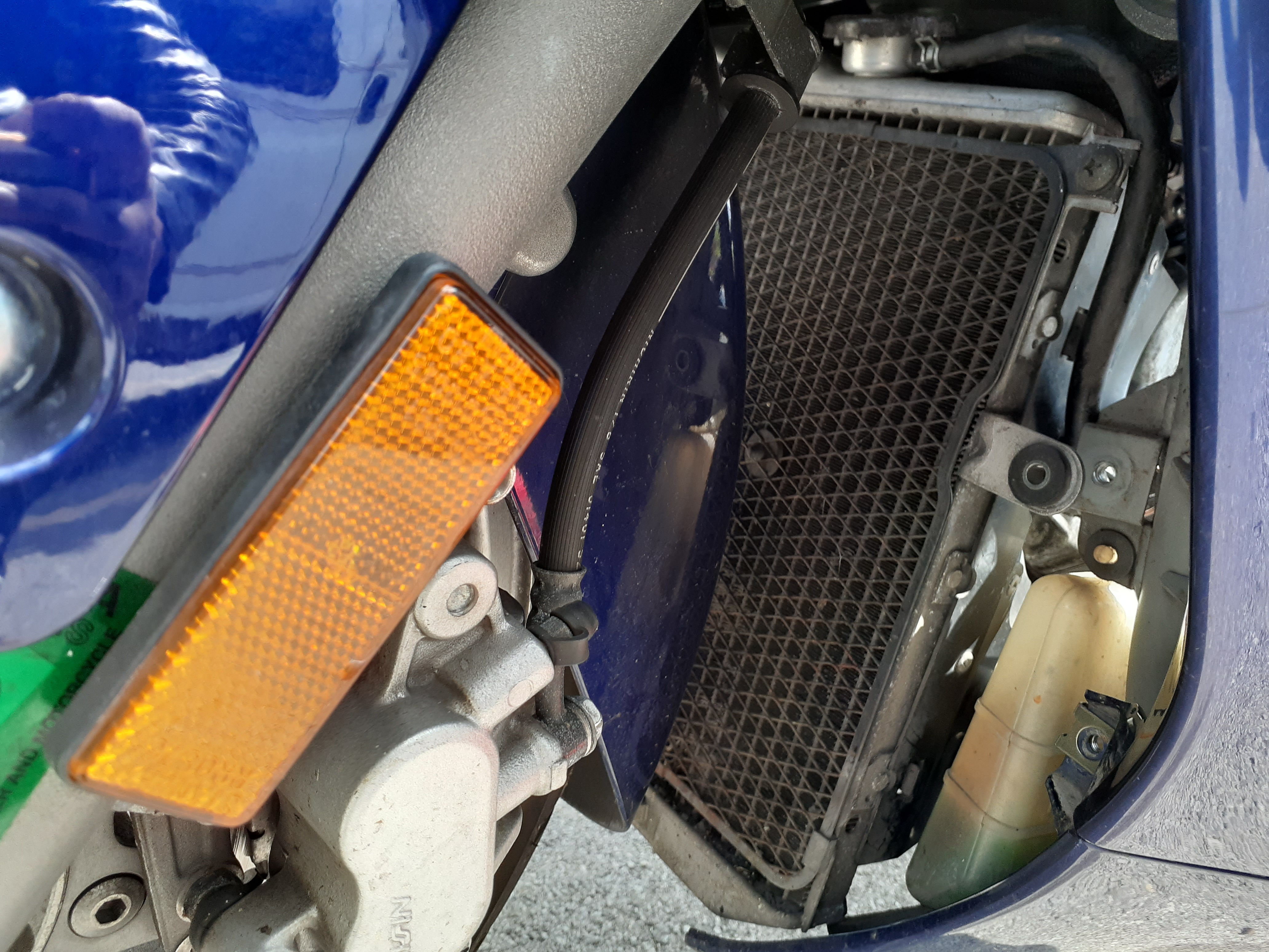I first tackled the misfire by replacing both plugs and both coils. On these Burgman 650s the job is super easy. Take off the shield for the radiator, remove a single bolt on the radiator, then hinge it out. I also removed the service cover for some extra visibility. Here's what the front looks like in its service position.