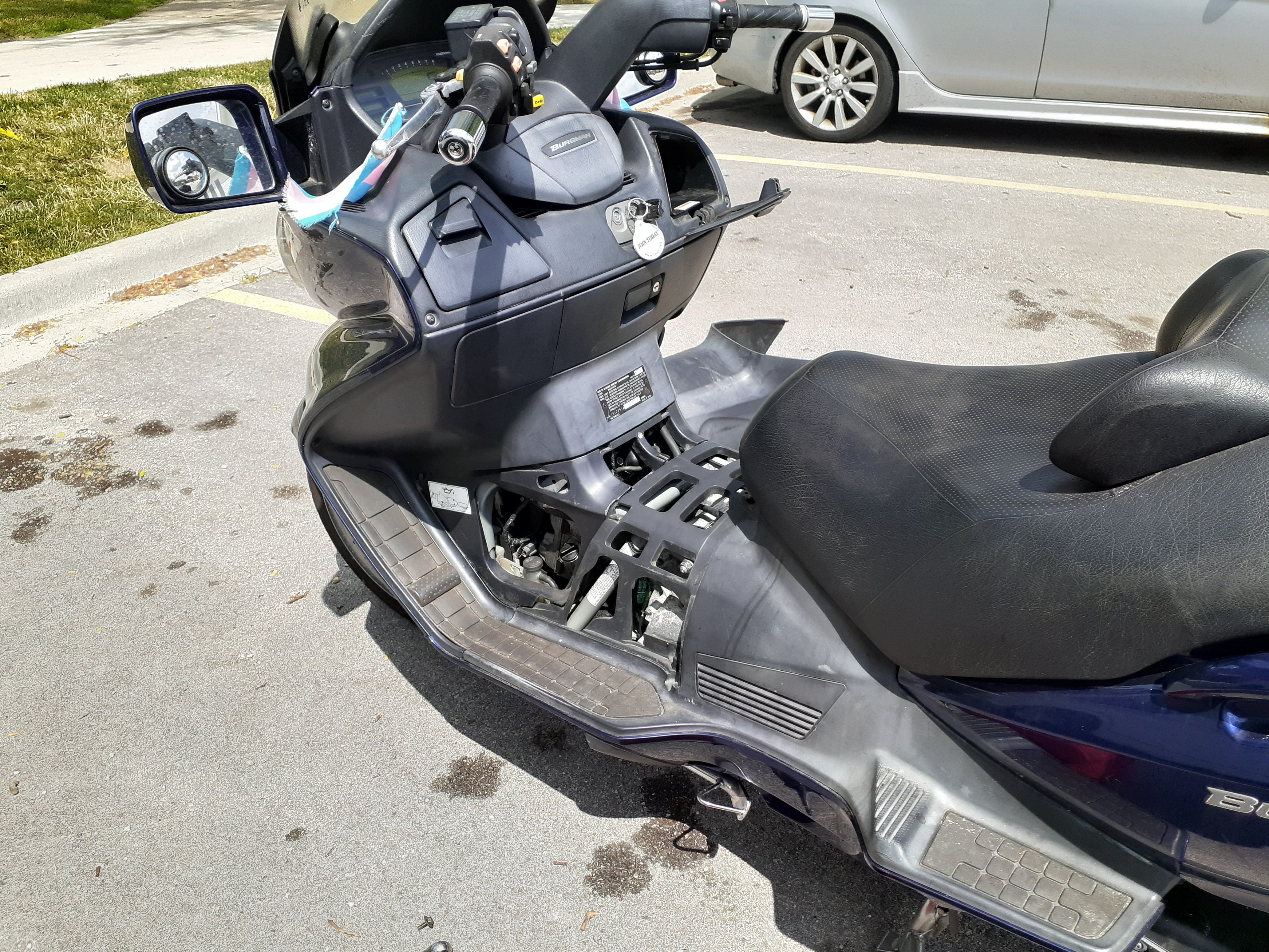 This Burgman has been through a lot. At 77,000 miles, the previous owner replaced the engine and transmission unit after the continuously variable transmission (CVT) failed. So now it has an 80,000+ mile body with a young, 40,000-mile engine. Even with the new engine, that previous owner had issues getting the new engine to run on both cylinders (an issue fixed with a new ignition coil).