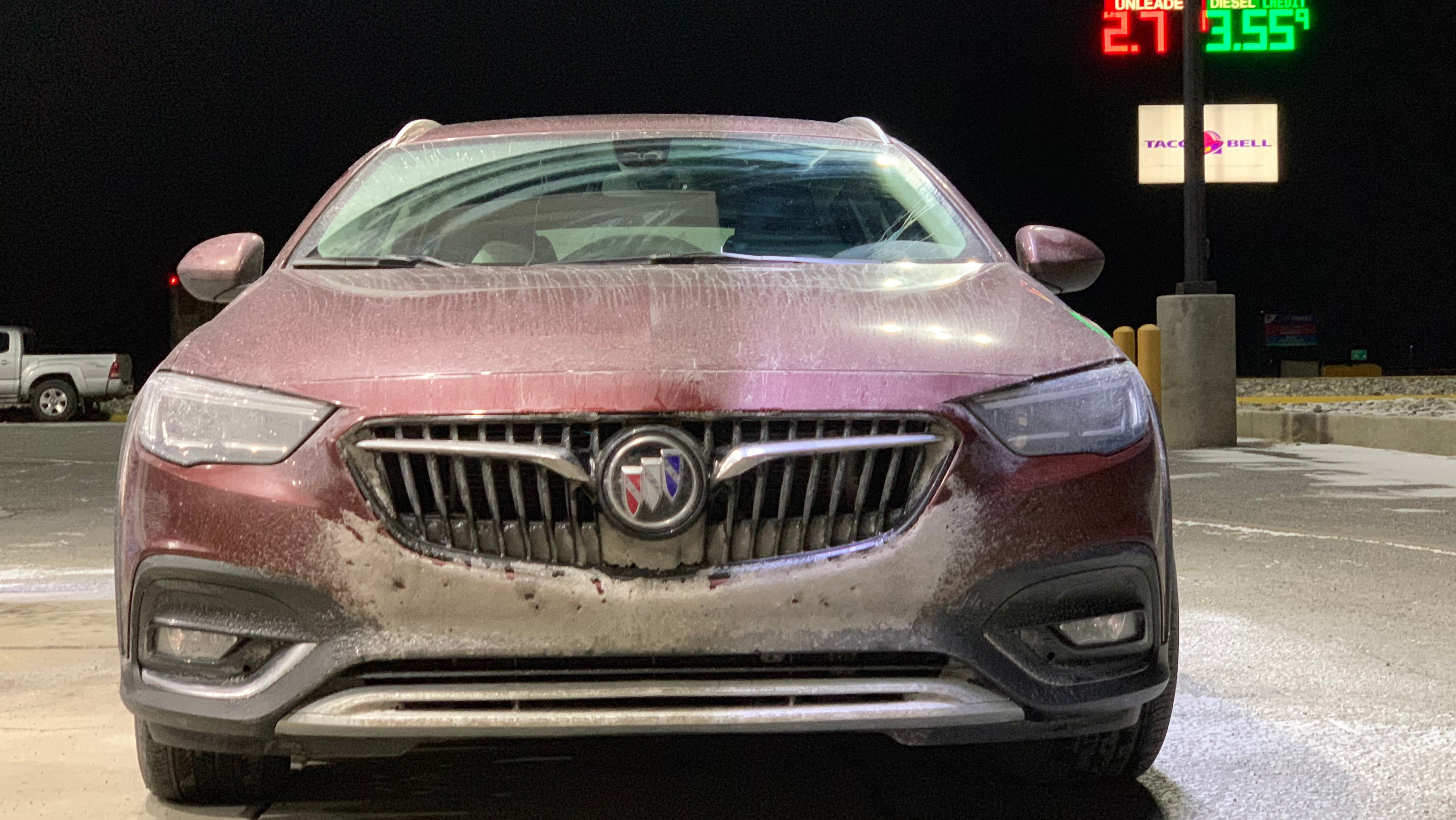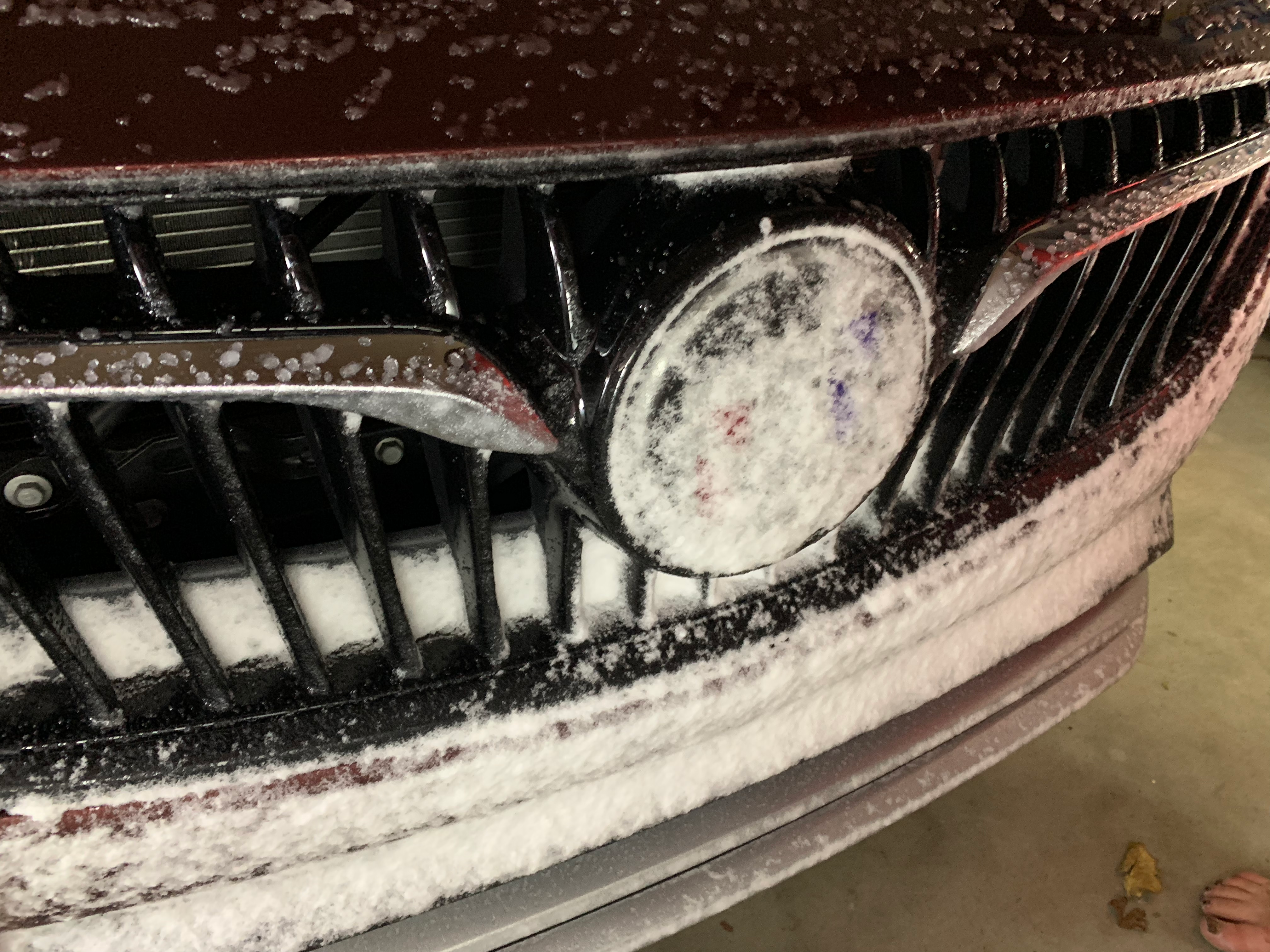 The downside? When I'm driving on the highway through the fluffy white stuff, it gets plastered to the front emblem. The radar can't read objects ahead through a fine layer of snow or ice, so it shuts off completely. From there, you have no cruise control whatsoever, which is a minor inconvenience over traditional cruise.