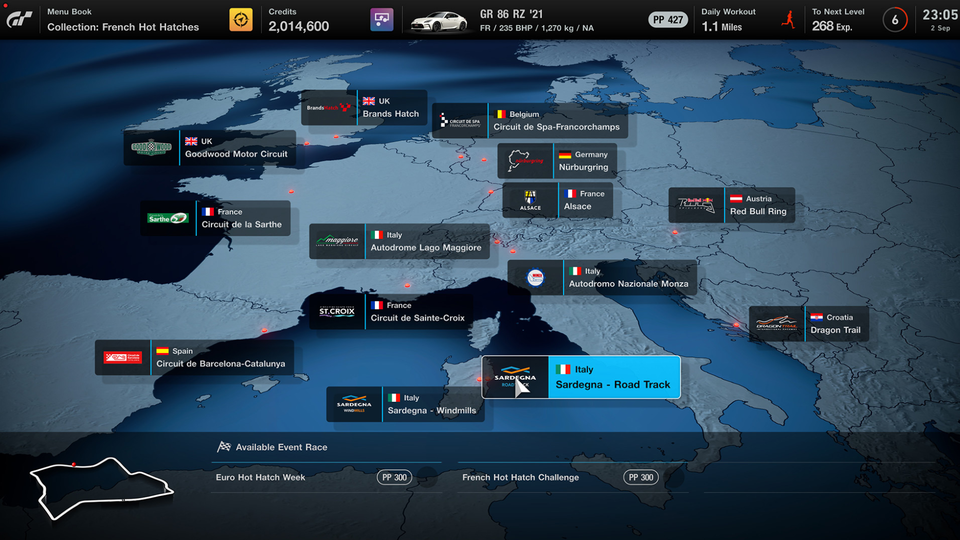 This one isn't entirely clear yet, because it's a single screen of a sequence of menus. Still, it presents something curious. The player here is highlighting the Sardegna track on the map, and under it we see two available races at that location. This deviates from the way events in GT have historically been organized, where the player selects a particular cup and then chooses one of the races it contains. Structuring the career this way has the benefit of offering players more freedom to race at the circuits they wish at any given time. On the other hand, it suggests a lack of multi-race championships with points — something classic GT games had, but GT Sport notably lacked.