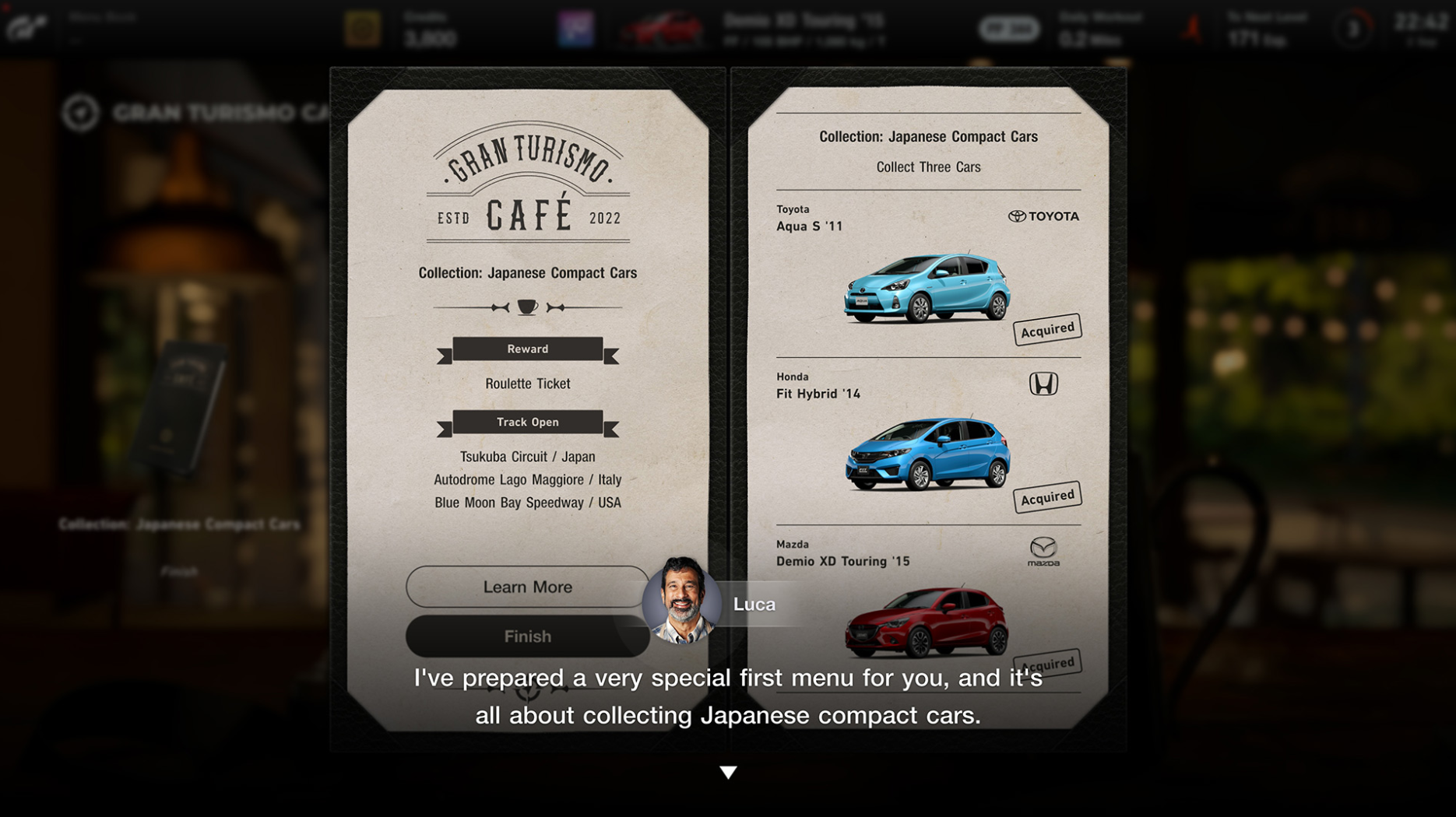 The traditional GT single player loop typically involves buying or winning cars, competing in races, then upgrading those cars with prize money, over and over again. GT7 could switch up this formula with a new aspect of the Campaign, called Gran Turismo Café. From the screenshot, it seems as though players will be asked to collect groups of cars, then go compete in playlists of events with them for rewards — like little side quests from standard car-PG fare.