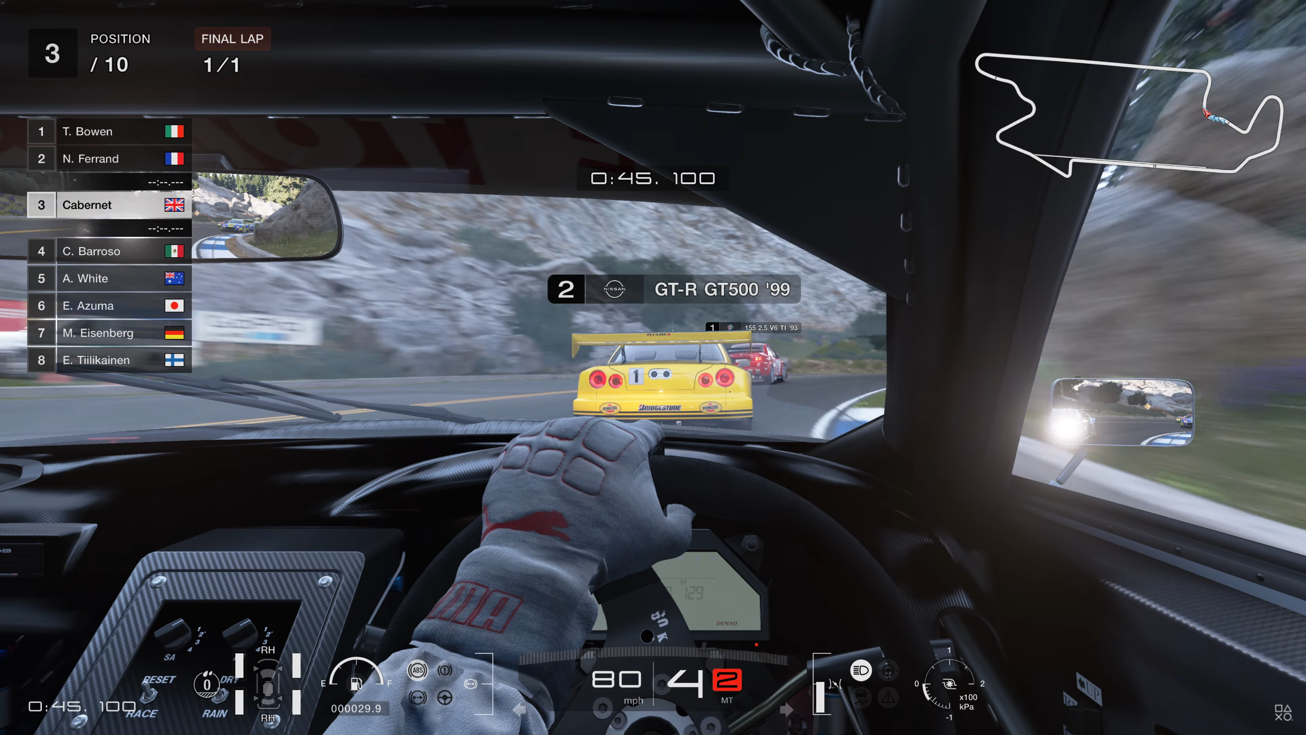 This might be my favorite shot of the entire trailer. Two beloved race cars — the 1999 Pennzoil Nissan Skyline GT-R GT500 and Alfa Romeo 155 2.5 V6 TI DTM — racing against each other even though they have absolutely no business doing so, in typical Gran Turismo fashion. At Trial Mountain, no less! Personally I'm more of a Calsonic blue man myself, but that yellow Skyline is synonymous with GT3, and the 155 was a standout member of GT4's roster.