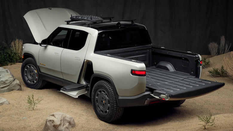 It all starts with the new color, called California Dune, which Rivian says evokes "the subtle natural undertones of the desert dunes with calming, earthy tones that offer a neutral and warm feeling." I think beige is in, baby, and this fairly muted tone really suits Rivian's design language. The 20-inch wheels have a new design reminiscent of our favorite rally cars, and you can either get them in matching California Dune or in dark grey — I have no clue why you'd pick the latter. In case you get stuck in the dunes, the California Dune Edition comes with roof crossbars and a pair of Maxtrax recovery boards. The R1T also has a redesigned power tonneau cover, a feature that's been buggy since launch.