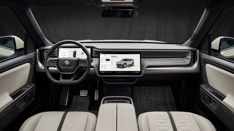 While other Tri-Motor R1 models have a higher-end Ascend interior with fancier materials, the California Dune uses the Adventure interior from the lower-end Dual-Motor models. That makes sense, as you don't want to have to worry about getting your nice interior all sandy while using these Rivians for their intended purposes. It does have a unique interior color scheme that pairs Sandstone with Black Mountain vegan leathers, and the Chilewich floor mats have the Sandstone color woven in as well.