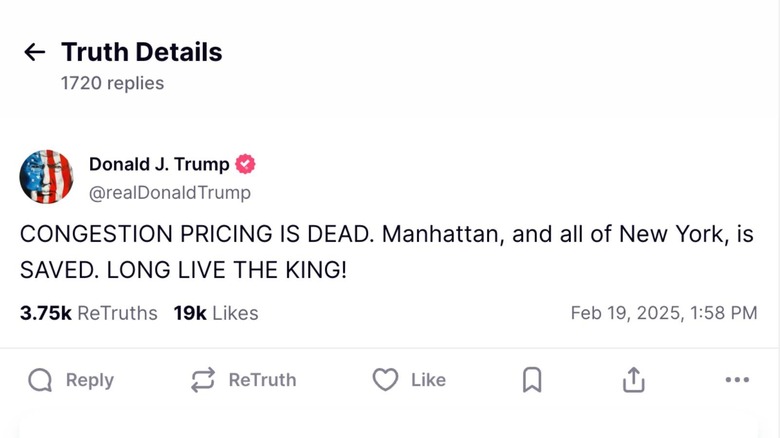 Last month when New York City finally instituted a pared-down version of the congestion pricing plan it introduced back in 2019, it was essentially an overnight success. Traffic dropped, allowing buses to move faster, the number of crashes went down, a wealthy man got mad about walking and it also successfully upset New Jersey. What more could regular New Yorkers possibly want? Unfortunately for those same people currently enjoying quieter and safer city streets, the Trump administration is doing its best to stop to all that. Today, the former "Real World: Boston" cast member who Trump put in charge of the Department of Transportation announced plans to kill the congestion relief zone.