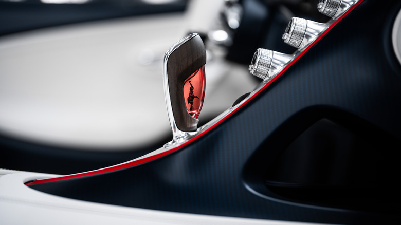 On the inside, the white car has tons of white leather with Lake Blue stitching and blue carbon throughout, plus red accents for the seatbelts, center dashboard spine and Dancing Elephant headrests. Its shifter is also even cooler than the black car's: the shifter itself is made of hand-crafted wood, and the elephant is encased in Italian Red glass.