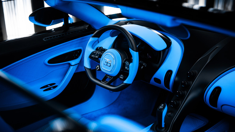 This second Mistral is much more up my alley. Its matte White Glacier paint is offset by Blue Carbon for all the lower exterior bits, like the splitter, side skirts and rear diffuser. The wheels are painted blue to match the carbon, which is a nice touch. There are a number of Italian Red accents in places like the center spine and the script under the active wing, which along with some Atlantic Blue bits celebrated "the Star-Spangled Banner and the French brand's roots," according to Bugatti — it even has a red-white-and-blue flag just aft of each front wheel.