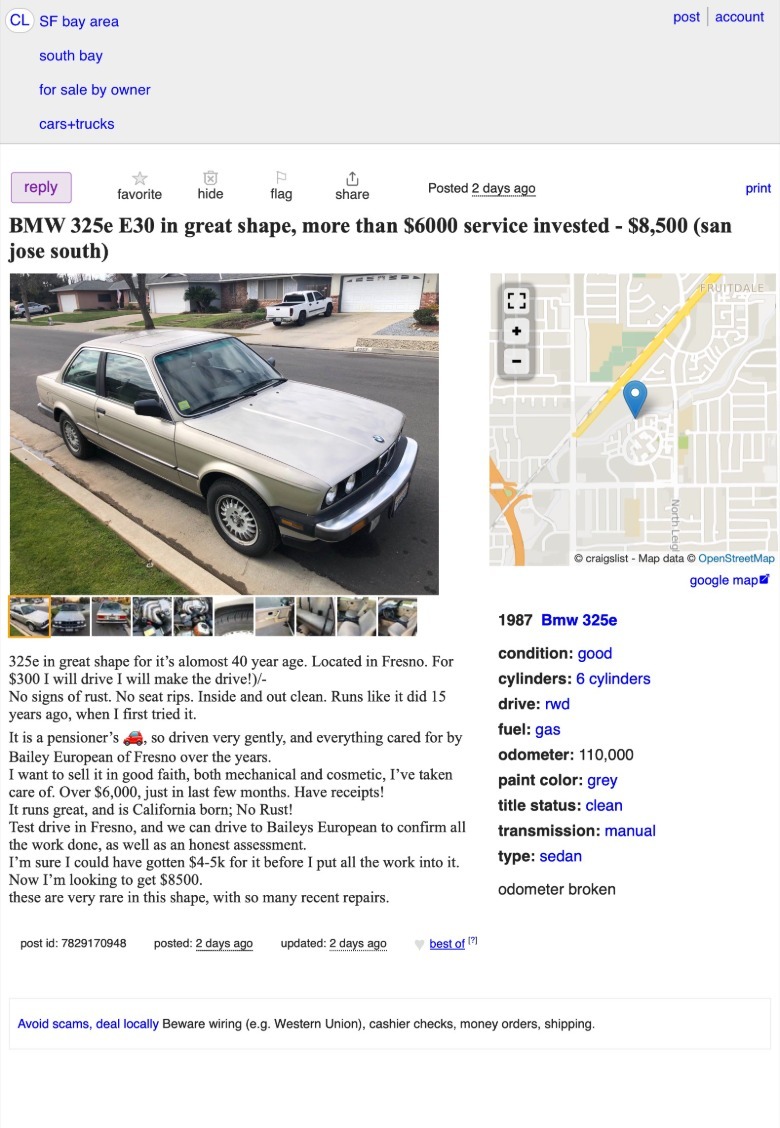 What's your take on this 325e and that $8,500 asking? Does that feel like a deal to get in the E30 game for under five figures? Or does that price demand a hairier-shirted i instead of an e?