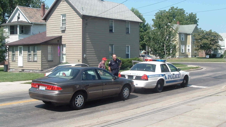 While standing outside, watching the traffic, I noticed a cop car waiting at a red light and an old guy in a Buick behind him... The Buick was creeping forward really slowly. It's not stopping... he HIT THE COP CAR!