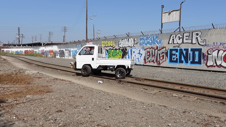 The project starts with the revelation that yes, a kei truck is about as wide as a set of train tracks, so that's a start. There's still a lot of work to get the truck running straight and true, however.