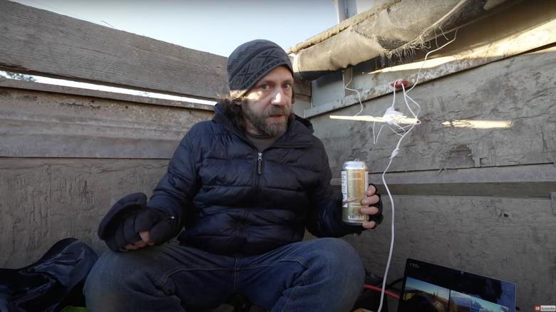 Just because Steve doesn't use a Pocket Rocket stove and a Toaks pot to make his meals doesn't mean he didn't bring along a few other camping-related luxuries. Step 2 is always a beer, although, this time around, it's non-alcoholic because stealth camping, alcohol and a vehicle are a recipe for a bad time if the cops show up. And you also can't camp in the back of a dump truck without a couple of car batteries to power your space heater and pizza oven. You take a pizza oven with you every time you go non-stealth camping, right? OK, so it isn't exactly a regular thing, but it probably gets lonely solo camping in the back of a dump truck, and a piping hot, freshly made pizza seems like the perfect companion. Plus, it does draw a clearer distinction between what he does for fun and what other people experience.