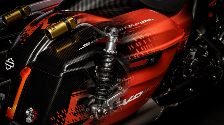 Harley claims the CVO Road Glide RR has carbon fiber bodywork, just like its race counterpart, but it also states a weight of 785 pounds "in running order" — that's over one Amber heavier than the 640-pound race bike. Some of that weight comes from the aforementioned lights and reflectors, but more likely comes from the street bike's full infotainment and audio system. The exhaust differs from the race bike as well, to a likely weight detriment, but that's excusable on a bike that needs to meet EPA regulations. Yet , despite all those weight increases, Harley kept the race-spec swingarm on the road bike.