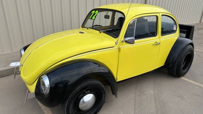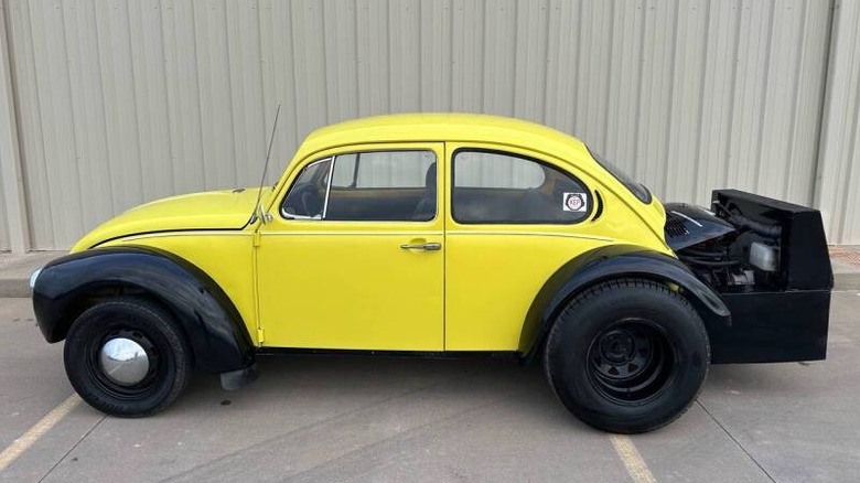 The rest of the car looks like a standard Beetle. The body has been painted yellow, and the fenders all black. In the front, the bumper has been replaced by nerf bars, while in the back there are trailer tail lights and a BBQ grill over the radiator.