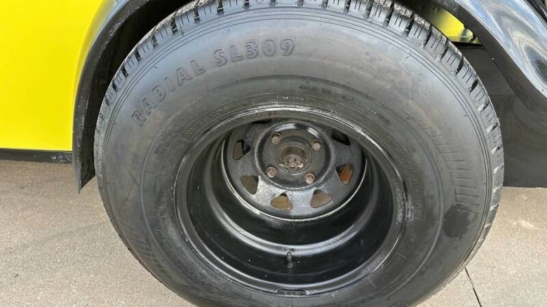 The wheels and tires in the front appear to be proportional to the car, but those in the back are huge, tucked under Baja-Bug-style fenders. Amazingly, those wheels are only four-lug, possibly mounted on spacers. All of the tires appear to be in decent condition, and the odd sizing difference between front and rear meats is accentuated by the bold decision to eliminate the VW's running boards. All it really needs is a pair of posts on the front upon which to strap some unwitting victims to become the scourge of the upcoming post-apocalyptic highways and byways.