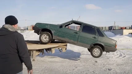 The thesis behind this video is very simple—How many times can we pull this Lada off a flatbed before it disintegrates? To get things started, the boys get the Lada up on the flatbed, hook a tow strap onto the car's aft tow hook, then hook the other end to an SUV. Vlad mentions that they wanted to put someone in the car and have them drive it off instead of pulling it off, but the car doesn't run so they have to make do. The first attempt at pulling the car off the flatbed ends with very little drama — a few scuffs on the car's rockers but nothing else. Vlad figures they pulled too quickly and thus the car didn't have many opportunities to really hurt itself coming off the flatbed. He decides to have another go, more slowly this time, and back up on the truck goes the Lada.