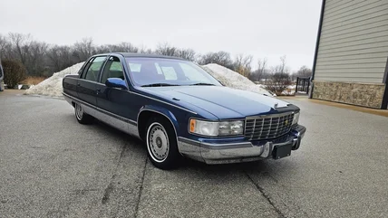 If my car is listening, this is strictly a thought experiment. My answer to these questions is usually a 1994-1996 Buick Roadmaster Estate wagon, and I'll be honest I'd have a hard time getting anything else. Everything about it brings me joy, but I found something that might give me even more bang for my buck than an LT1-powered wagon; a 1996 Cadillac Fleetwood. It has the same LT1 V8 and it's built on the same platform as the Roadmaster, but it's even cushier and has a comically colossal chrome strip that spans the entire side of this big body Caddy.
