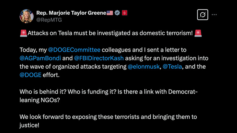 Georgia Rep. Marjorie Taylor Greene, who I want to emphasize does not represent my district, is mad. This isn't new, of course. She's always mad about something. This time around, though, it's people exercising their Constitutionally guaranteed right to protest outside Tesla dealerships. After Trump claimed he would prosecute anyone arrested in connection with the protests as domestic terrorists, Greene announced on Twitter that she'd sent a letter to both Attorney General Pam Bondi and FBI Director Kash Patel demanding they open an investigation into the protests, insisting that "Attacks on Tesla must be investigated as domestic terrorism!" Not property. Tesla the company.