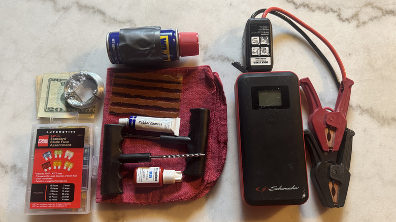 In addition to tools, here are a few other universal necessities you might need to pack along as well. I don't go anywhere without a fully-charged jump pack. If you can, make sure you get one with a built-in tire inflator. You can bring a bike pump and push the air in yourself, but we have the tools to avoid such manual labor. Speaking of inflating tires, you're bound to get a nail or a spoon or something jammed into your tire if you drive enough miles, so pack a tire repair kit as well. They're cheap and easy to use, so that's a no-brainer. At the top of the photo you'll see my special tool to fix problems with motion. The can of WD-40 comes in handy when you have something that should be moving freely but doesn't, and the duct tape wrapped around it is for when you have something that is moving freely when it shouldn't. Apply liberally.