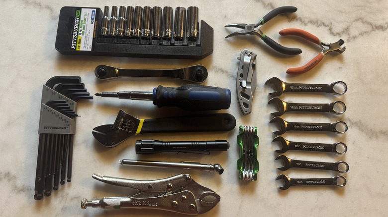 Every car and motorcycle will require a different tool kit with different ingredients. My regular rides are generally old and German, so I pack metric tools and torx keys, for example. With a full set of deep well sockets, a complement of stubby box wrenches, a variety of pliers, cutters, and a multi-head screwdriver, I can take apart and put back together almost everything on any of my cars. It might be tedious and annoying to not have electric ratchets or impacts, but they'll still get the job done. A flashlight and a couple extra batteries also come in handy. A nice sharp knife can also be helpful in a pinch for survival purposes beyond just fixing your car. Definitely make sure you have all of the tools needed to remove one of your car's wheels, including any potential wheel lock keys, the correct socket for your wheel nut, a breaker bar, and a jack that will fit under your car. If you have lowered your car, as I have, make sure the factory jack still fits underneath.