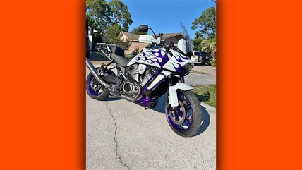 This Pan America showed up on Facebook Marketplace with some truly terrible photos, but they're enough to show the vibe this bike is going for. Purple wheels and crash bars match the flame print laid over the white fairing and tank, street tires adorn the alloys. It has color-matched enduro-style unpadded foot pegs, and a truly massive muffler. This is all absurd for the Pan America's intended function, but it goes to prove one thing: The Harley kids are all right.