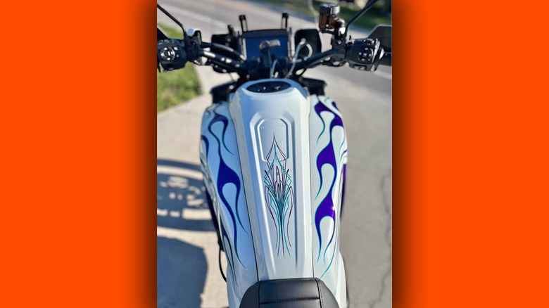 Pinstriping and flames are classic Harley couture, but the white/purple/blue color scheme almost feels more Busa Boy to me. Sure, this exact paint scheme would fit fine on a Sportster, but picture it on a Hayabusa — doesn't it fit a little bit better there? Maybe this bike's painter lived a prior life as a Busa owner, and the Pan America moved them into Harley ownership. Truly expanding the brand.