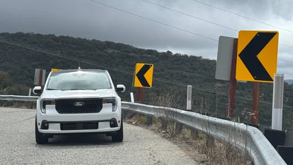 Kicking the truck into Lobo mode makes everything feel sharper and more exciting. The main differences are sharper throttle input, a greater emphasis on synthetic engine noises in the cabin, and a more aggressive rear differential. That simple switch makes the truck feel like a leashed animal, pulling against the reins to scrabble at the road and shoot away from a hairpin. Even though much of what I'm feeling is heightened by the fake engine noise, I kind of don't care. There's an old-school aggressive feel to this thing, like it's alive underneath me, and it's eager to go as quickly as I'll let it. While the more normal modes have the Maverick Lobo wallowing through corners like the econo-truck it's based on, Lobo mode's active differential work has the truck pivoting around an axis in a sports sedan kind of way. I find myself putting in less steering input and getting around the corner flatter and more composed. Flipping between the modes on a fast road is pure delight.