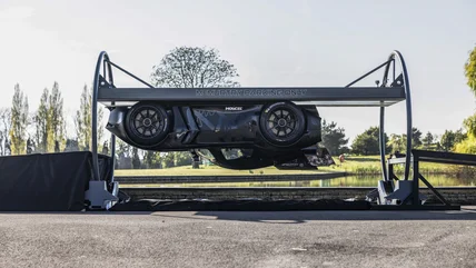 McMurtry didn't have to deal with the pesky logistics of finding a tunnel long enough to safely complete the run. The British manufacturer constructed a rotating rig at its headquarters in England. The hypercar drove up a ramp onto a metal road deck and came to a stop. Thomas Yates, the driver and company co-founder, then switched on the fans. For those looking to do the math, Spéirling weighs 2,200 pounds. With the stopped car's fan whirling at 23,000 rpm, the rig was rotated to invert the road deck. The rig was locked upside down. Then, the hypercar rolled forward a few feet before stopping while inverted. The rig rotated the road deck back down, and the Spéirling drove off like nothing happened.