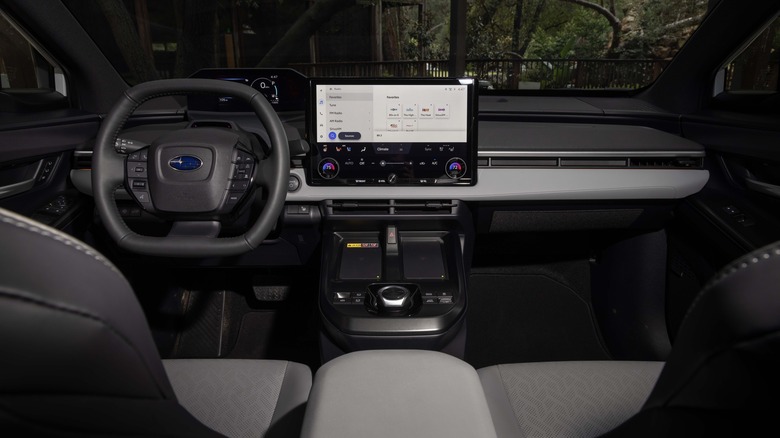 Beyond straight-line performance, the 2026 Solterra has a new all-wheel-drive system with better power distribution and control, and updates to the suspension and electric power steering. It still has a good-for-its-class 8.3 inches of ground clearance, and Subaru's X-Mode system with off-road drive modes and Downhill Assist Control. Subaru's EyeSight suite of driver-assistance features is standard, with automated emergency braking, front cross-traffic alert, blind-spot monitoring, lane departure alert, adaptive cruise control with traffic jam and lane-change assist, and a panoramic view monitor among the included tech features.