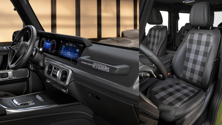 Perhaps the best part of the Edition Stronger Than The 1980s is on the inside, where the black leather seats have Dove Grey fabric inserts with a wonderful plaid pattern taken straight from the old G-Wagens. The grab handle on the passenger side of the dashboard has a pretty cheesy "Stronger Than The 1980s" logo etched into the wood trim, and the center console has a "1 of 460" badge. Another unique touch is on the side sills, where you'll find a topographical design of the Schöckl mountain in Graz that Mercedes has tested every G-Class on since 1979, complete with coordinates.