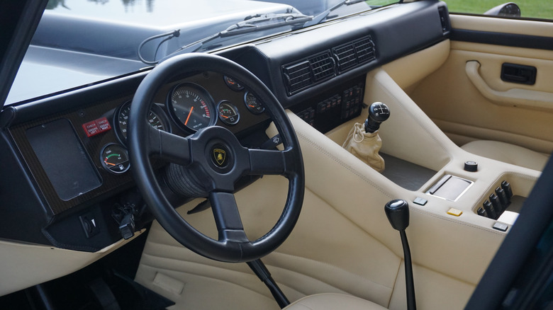 More on that engine, though. What a piece of art. Famously, the LM002 borrowed its engine from the Countach, pumping out 444 horsepower and 368 pound-feet of torque. Today that's nothing, but in 1986? It was unprecedented. All of that power is routed through a slightly crunchy dog-leg five-speed manual gearbox to a beefy four-wheel-drive system. I know that this car is a Lamborghini, but it is deeply slow. When it was new, the 0-to-60-mph time was about 7.7 seconds. Today, a Toyota Prius will best it by nearly seven-tenths of a second, but you won't give a damn about that.