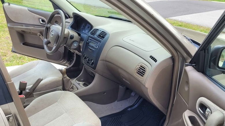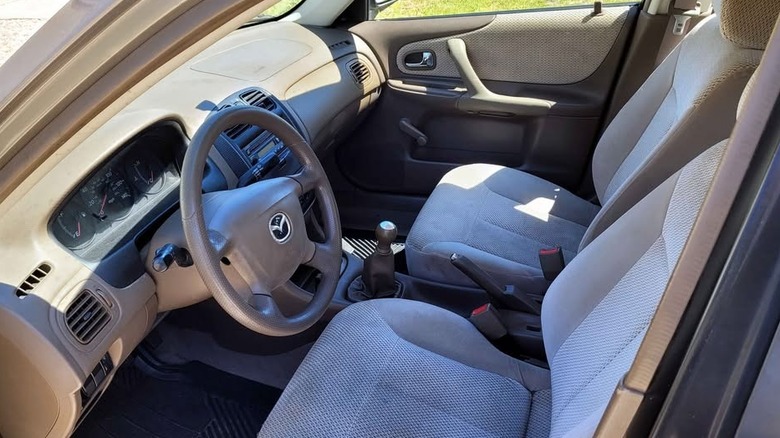 Behind that grille sits a 105-horsepower 1.6-liter four-cylinder, which the seller says is good for a laudable, if not stellar, 31 miles to the gallon. A typo in the ad claims the transmission to be a manual six-speed, but five cogs is all these cheap-seat cars ever got. The drivetrain has motivated the Mazda to a mere 89,191 miles, and according to the ad, it continues to be in "perfect running condition." Regardless of that assertion, the miles, and more importantly, the age, mean that the car should be checked over for regular service items like a brake fluid flush and timing belt change. The ad says nothing about past services but does note that the car is accident-free and suffers no rust anywhere.
