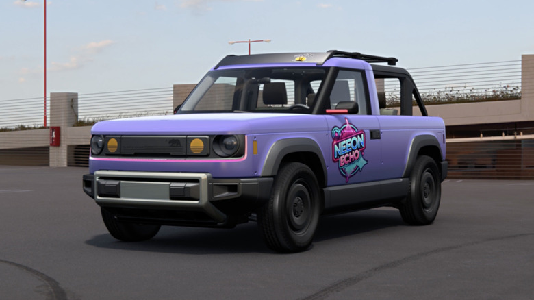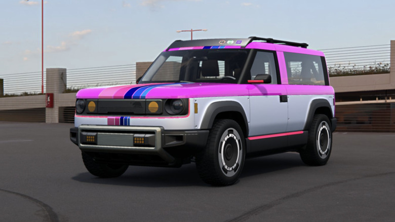 I have elected to turn my blank Slate into a blurple backless fun machine that prioritizes vibes over practicality. I tried to emulate the vibe of a two-door soft top Toyota RAV4 or Suzuki Vitara, and I feel like the purple and pink color combo is very indicative of that era. I wish there was a wider array of decal choices, because in a perfect world I would put the iconic 1990s teal and pink scribble design that you see on paper cups and plates, but unfortunately that design is omitted from the configurator. Come on, Bezos! I chose to lower the suspension and keep it on standard steelies and street tires, since it is just rear-wheel drive after all, and I figure it would give the lil truck's already low EV range a fighting chance in the real world.