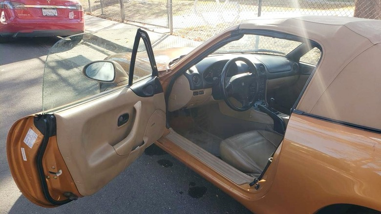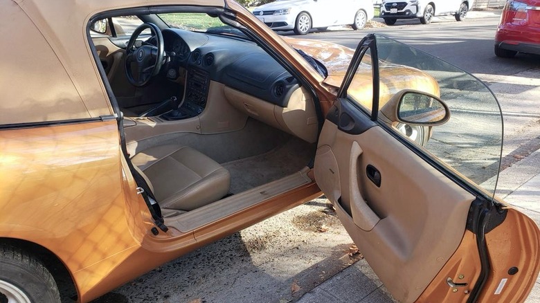 Speaking of juice, this 2000 Mazda Miata NB is painted in Evolution Orange Metallic. In the pictures, that comes across as gold, making its "18K" factory color code all the more appropriate. The seller claims this to be a very rare color, saying that only 644 so-painted editions were sold in the U.S. Paired with that is a camel vinyl top with a glass back window, factory five-spoke alloy wheels, and a tan interior with leather seating surfaces.