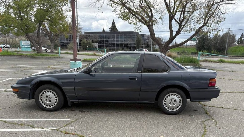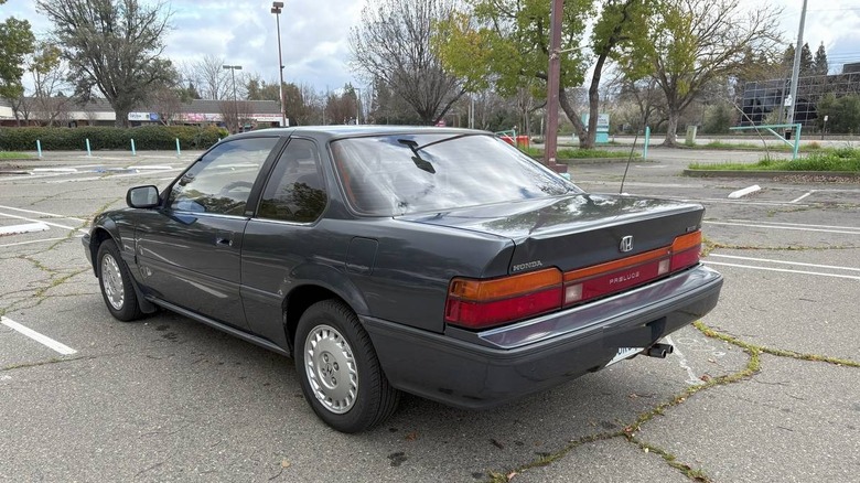 This Prelude is from the third generation of Honda's iconic coupe lineup and the second with headlights that are kept out of harm's way when not in use. The rest of the car is a little less dramatic in style but still impresses with its long-nose, short-deck design. It's painted a dark blue hue, which might have served it stealthily back in the day, but now could be seen as a less desirable color for a collectible. Somewhat annoyingly, the factory wheels on the car have been mounted incorrectly, with the turbine blade design facing different ways on each end.