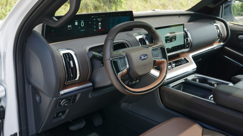 Things are a bit more complicated inside, both literally and figuratively. The interior of the Expedition is totally redesigned for the 2025 model year and there are three things you're going to notice right away: the 24-inch screen by the windshield, the smaller touchscreen right below it and the squircle steering wheel that seems to be absent of buttons. I'll start with the panoramic screen and work clockwise.