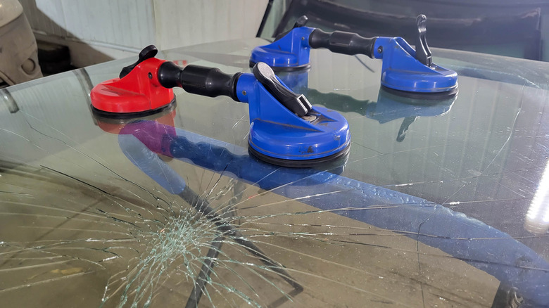 We want to do this as soon as possible. If you have someone to help you, it'll be less stressful. Otherwise, some heavy-duty suction cup window holders should do the trick. Use them carefully to handle the windshield and lower it into place. Once you get it on there, you can move it around a bit to get the windshield in the right spot, but don't mess around with it too much.