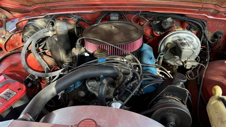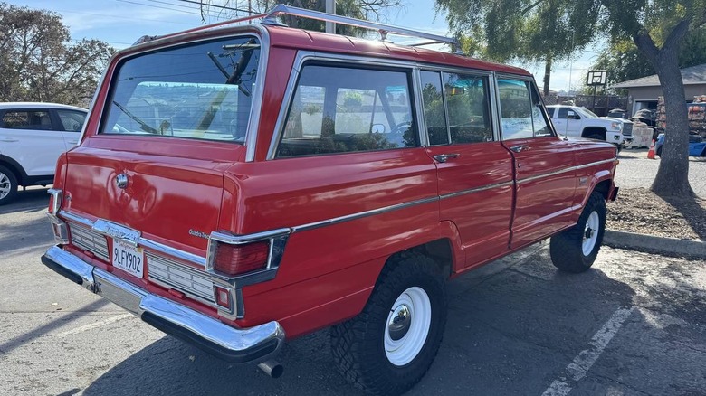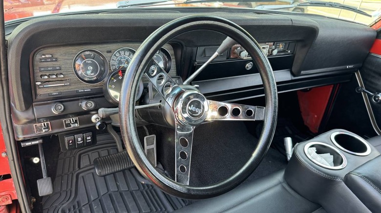 That 4WD system is Jeep's Quadra-Trac, which is based on a Borg Warner 1339 transfer case with two speeds and a limited-slip torque-vectoring differential between front and rear axles. That's switched between 2WD and 4WD by a switch that Jeep strangely squirreled away in the glove box. Per the ad, that switch shares space with a modern 12-volt relay box for powering modern devices on the go and the control module for the Holly Sniper EFI that feeds the 360 V8.
