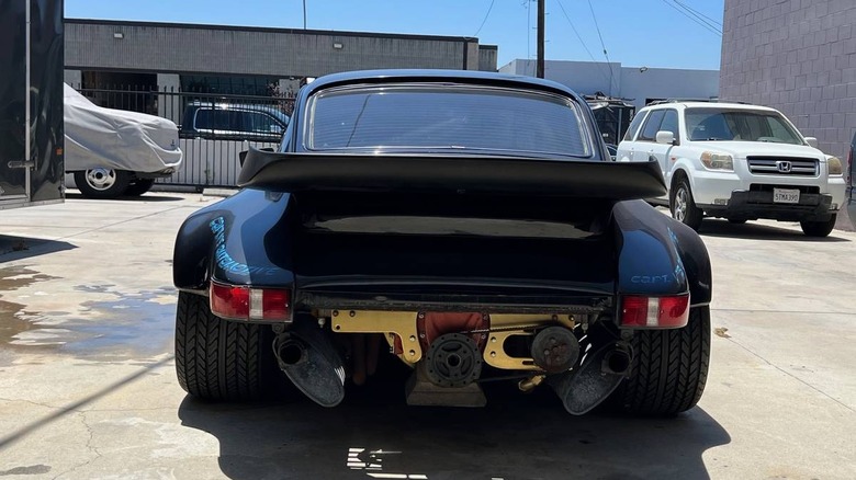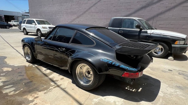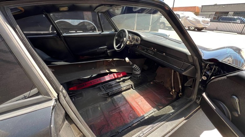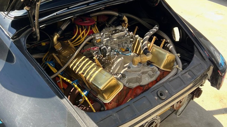 Per its ad, the conversion was performed around 40 years ago, when the car had approximately 37,000 miles on the odometer. It now reads 37,480 and has been sitting in a "clean garage" for the past four decades. This is a long-nose 911, but it sports wide fender flares, both front, and rear and has no bumper in the rear to accommodate the beefier V8 that now holds court under the Turbo-style wing. The engine looks to be a tidy installation, and expense was taken to put braided metal coverings on all the hoses. A four-barrel carb sits atop a low-rise intake, while exhaust is handled via a set of tubular headers.