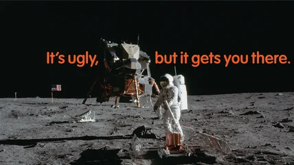 If you bought the July 25, 1969 issue of the New York Times, the front page story covered the Apollo 11 astronauts returning to Earth and entering quarantine. NASA wanted to be sure they weren't tracking back a contagion that would put the planet at risk. Flipping all the way to the back page, you would have seen a photo of an Apollo Lunar Module model with the caption, "It's ugly, but it gets you there." While there was no VW logo, the rounded geometric typeface used in previous iconic ads made it clear the message was from Volkswagen.
