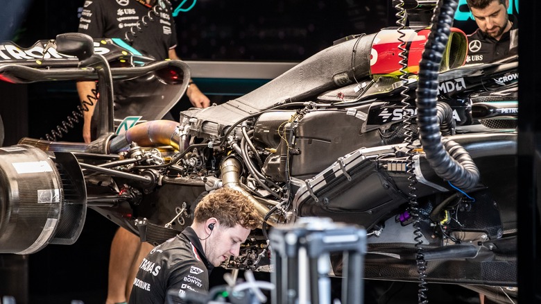 The YouTube channel Driver61 dove deep into Mercedes' F1 engine, and it's a great watch. A standard road car may have a thermal efficiency of 30%, meaning it can transform 30% of its fuel into forward motion. F1 engines can achieve more than 50% thermal efficiency. This is thanks largely to the MGU-H, a generator-like device attached to the turbocharger shaft, which transforms waste heat in the exhaust gas into rotational energy to recharge the battery, which can then power the crankshaft-mounted MGU-K electric motor/generator that puts out around 160 hp. Mercedes also split the turbo in half, putting the hot exhaust part on the front of the engine and the cooler compressor part on the back side, reducing the temperature of the air going to the intake. Cold air is dense air, and dense air makes more power.