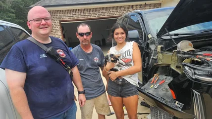 "Did you know we don't just rescue cats out of trees?" the Callisburg, Texas, Volunteer Fire Department posted on Facebook. This particular feline didn't scramble for the brambles, rather she managed to get stuck under the hood of a Cadillac Escalade, not exactly her natural habitat. Firefighter Justin Friddell and Firefighter/Paramedic Chris Kundrock responded to the urgent call, despite being neither auto mechanics nor veterinarians.