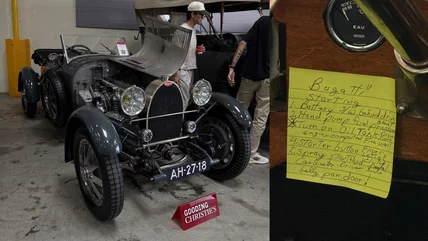 Of course, all of my favorite cars were Bugattis. Gooding's auction includes 10 Bugattis this year, from a brand new Bolide and a 1994 EB110 Super Sport to a barn find Type 57 Ventoux and a race-winning Type 35B Grand Prix. The latter two were at last weekend's preview, along with three of the others. Sometimes these old, complicated cars have multi-stage starting sequences that you really have to get right in order to get going, as evidenced by the note stuck to the dashboard of this 1927 Bugatti Type 43 Grand Sport.