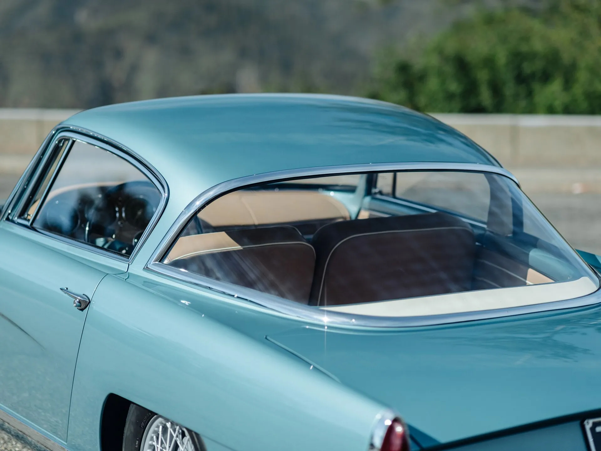 LML/765 is far more dramatic than a regular DB2/4, eschewing those cars' bulbous rooflines for a sharply raked greenhouse with a wraparound rear window, a Bertone signature. It has crisp creases atop the fenders, and the rear wheel arch partially covers the top of the tire. I love the subtle tailfins at the rear, and the thin, wide grille that retains Aston's trademark shape and is echoed by the contours of the front bumper. Other cool details include the chrome spear on the hood and the trunklid's lip that protrudes over the rear panel, and I just adore the metallic teal paint.