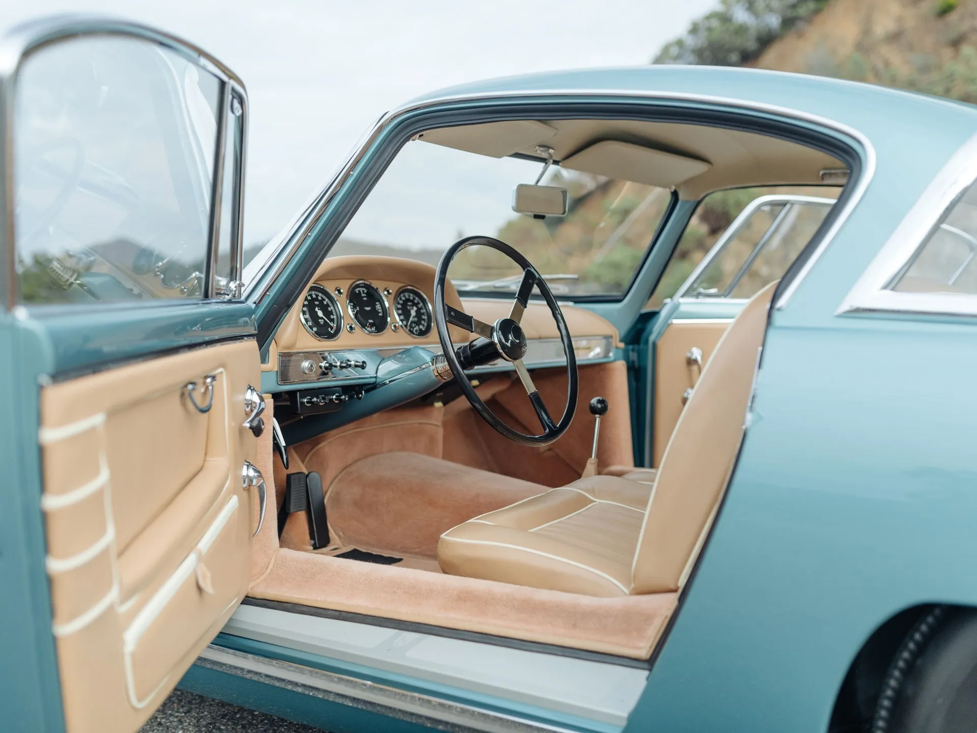 Bertone worked its magic on the interior, too. The simple dashboard has shades of Mercedes 300SL, with prominent gauge pod and a thin metal accent panel running the length of the dash that's punctuated by a handful of switches and an Aston Martin badge. In contrast to the body color bits on the dash and doors, the seats and door panels are covered in lovely beige leather with cream accents, and all of the carpeting is matching beige. This is strictly a two-seater, with a parcel shelf behind the front seats.