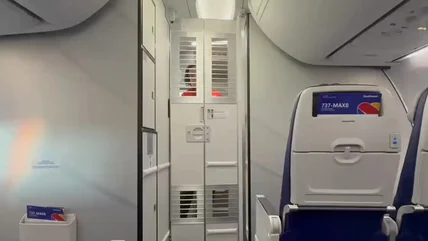 Southwest's first plane with a secondary barrier was a Boeing 737 Max 8 recently delivered to the carrier and entered service over Labor Day weekend, according to CNN. The barrier itself doesn't look like something you would see on an armored vehicle from the photos and video shared by Southwest. The folding gate was installed between the aircraft's first passenger door and the cabin. It can be locked into place, allowing for safe and easy movement between the cockpit and the forward galley and lavatory. Without the barrier, flight attendants will block the aisle with a beverage cart when opening the door.