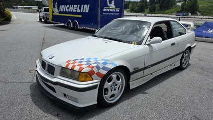 I was introduced to Michelin's BMW M3 Lightweight after towing it around Road Atlanta's hilly access roads as mystery ballast inside a trailer. Once the tiremaker's engineers dropped the door to reveal their surprise, the car was immediately recognizable from its Alpine White paint and tricolor M-stripe flag decal. The M3's oxidized headlights also told the story of a car that had been put through its paces.