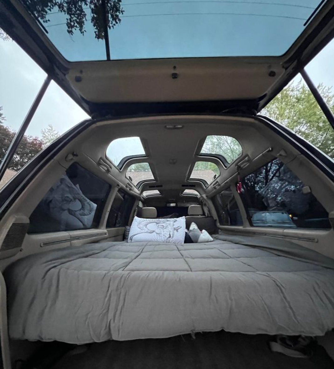 Just look at how easily it goes from usable car to camper! And no one is immune to the coziness of that sleeping area. Some of us are lying in the gutter and staring at the stars, but the luckier among us are lying in a TownAce and getting a decent nights sleep. The airy greenhouse extends all the way from the sleeping area to the cockpit. This is a sight-seeing vehicle if every there was one.