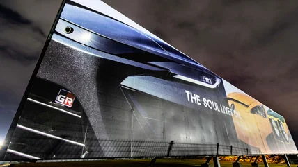 Toyota brought both race car and road car GR prototypes to the Goodwood Festival of Speed earlier this year, where we got to hear the front-mounted V8 engine roar, and now it seems the company is finally almost ready to reveal the new supercar. The brand's Japanese PR Twitter account posted photos of a new billboard that has been erected at Fuji Speedway, showing the front ends of a Toyota 2000GT, an LFA, and the new GR model without any camouflage. Sure, we can only see the headlight and a bit of the front bumper, but we might not have to wait much longer to see the rest. In a linked post on Toyota's website, chairman Akio Toyoda says the full story will be revealed on Monday, October 13.