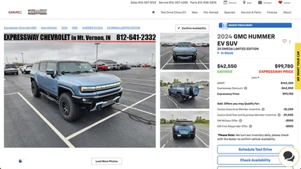 The news comes to us via GM Authority, which noticed several dealerships across the country that were putting massive amounts of cash on the hood of leftover 2024 Hummer EV SUV 3X Omega Editions. Expressway GMC in Mount Vernon, Indiana, listed a brand new Hummer EV with just 178 miles on the clock for $99,780. Keep in mind, its original sticker price was $142,330. That works out to be a $42,550 discount. It's not the only one, either. Jerry's Buick GMC in Weatherford, Texas, slapped a $40,648 discount on a Hummer EV, bringing the price from $140,295 to $99,647.