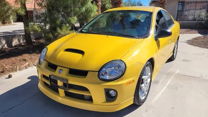 This 2003 Dodge Neon SRT-4 is painted in Solar Yellow and sports its factory 17-inch alloy wheels. According to the ad, the tires wrapping those wheels are new, as are the brakes behind them. Power for the SRT-4 comes from a 2.4-liter DOHC 16-valve four-pot with its volume turned all the way up by way of a Mitsubishi TD04-L-16GK turbocharger, dumping into a low-restriction two and a quarter inch exhaust.